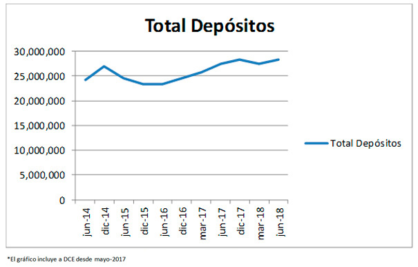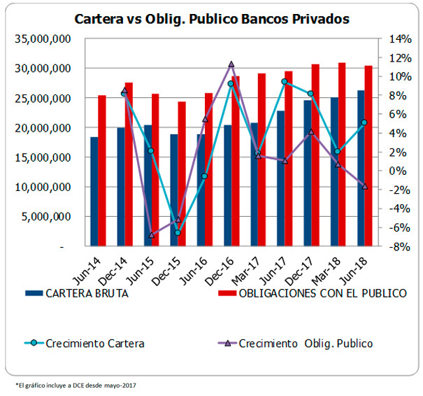 A dic-2017, los depósitos aumentan en 4% frente al año anterior (con la incorporación de DCE el aumento es de 7%); a pesar de que en los trimestres intermedios del 2017 los depósitos dejaron de crecer e incluso decrecieron, la inyección de liquidez de finales del 2016 permitió que los bancos buscaran crecimiento de cartera y recuperaran los afectados indicadores de rentabilidad durante el 2017. A junio-2018 los depósitos muestran un crecimiento anual de 3.2%, pero entre dic-17 y jun-18, estos caen en 0.9%, y en el trimestre se reducen en 1.7%. Este comportamiento confirma que una vez que la economía absorbe la liquidez de los préstamos adquiridos por el estado, los depósitos del sistema pierden la dinámica de crecimiento. Como consecuencia se espera desaceleración del crédito (que entre junio -17 y junio-18 aumentó en el sistema de bancos privados en 15.6%) y por tanto menores resultados de la gestión operativa en relación con el 2017.