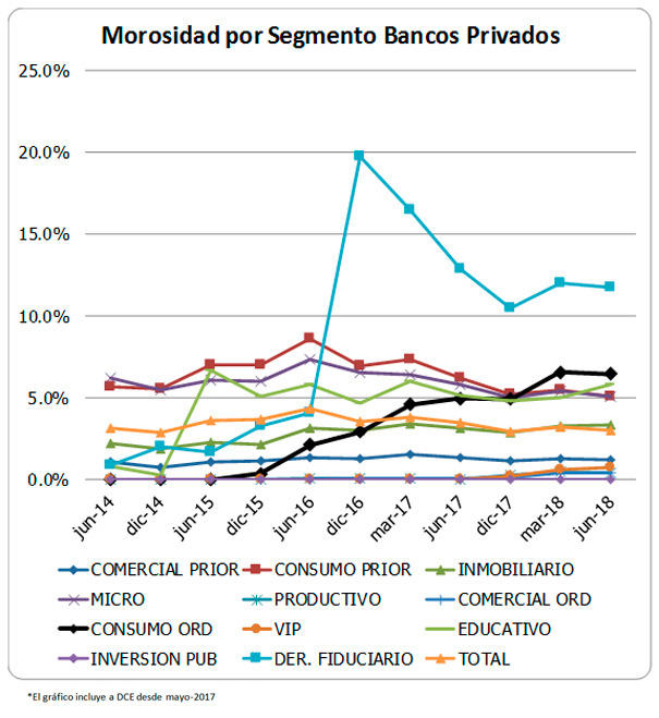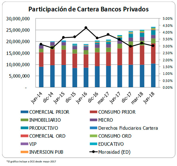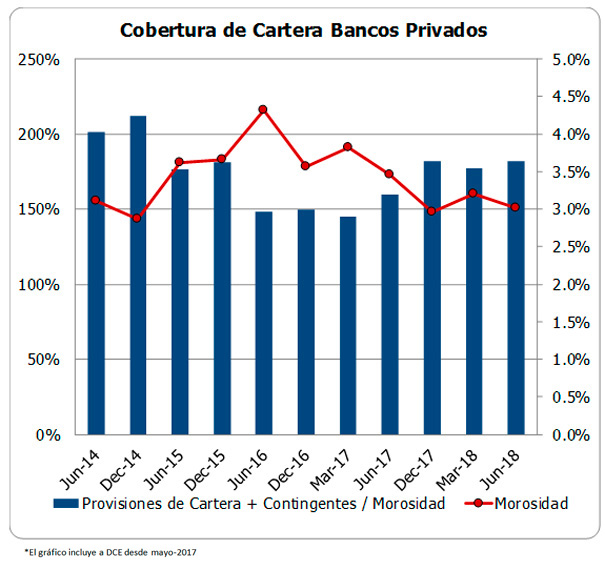 La morosidad de la cartera del sistema que a dic-2017 se reduce a 2.96% a jun-2018 muestra un ligero aumento a 3.02%, a pesar del crecimiento registrado de la cartera bruta. Estos indicadores de morosidad incluyendo la cartera reestructurada que muestra una mora de alrededor del 31%, suben a 3.99% y a 3.97% a dic-2017 y jun-2018 respectivamente.